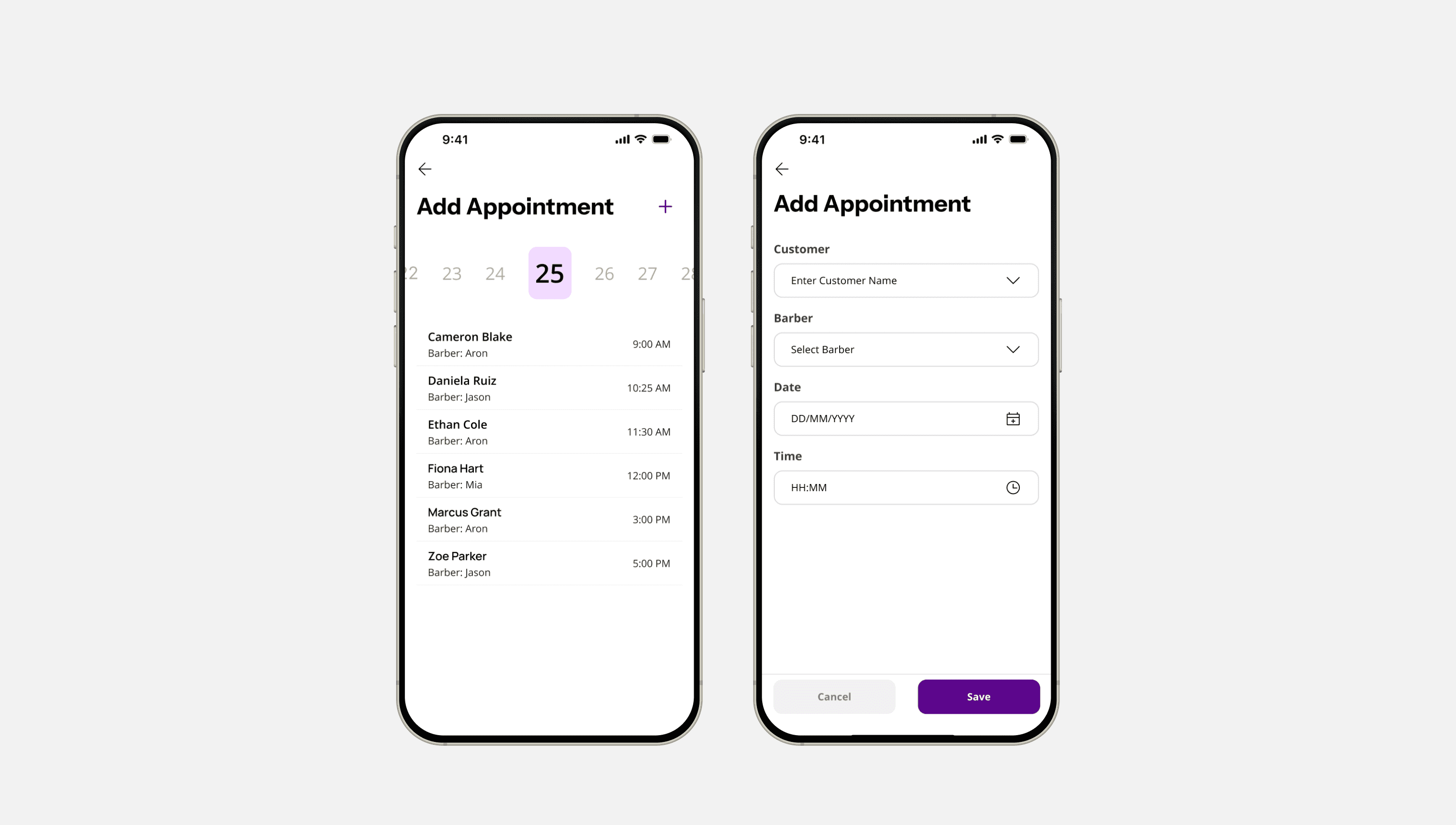 Introduce a built-in calendar with a clear daily timeline and the appointment function (customer, barber, date, time) to keep bookings organized and error-free.