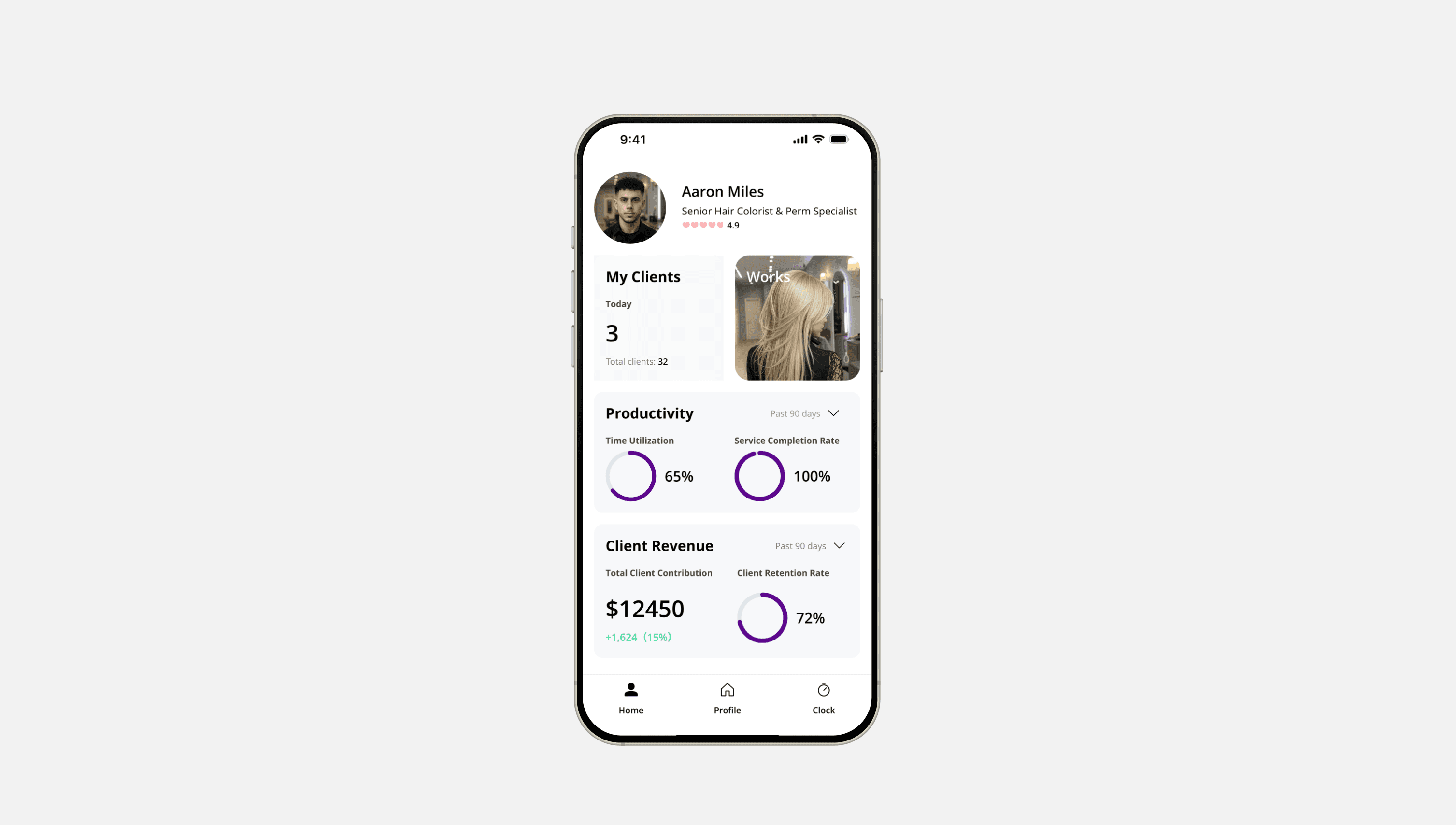 I designed a personal dashboard with a card-based layout, centralizing clients, portfolio, efficiency, and growth metrics in one place. This enables stylists to:
