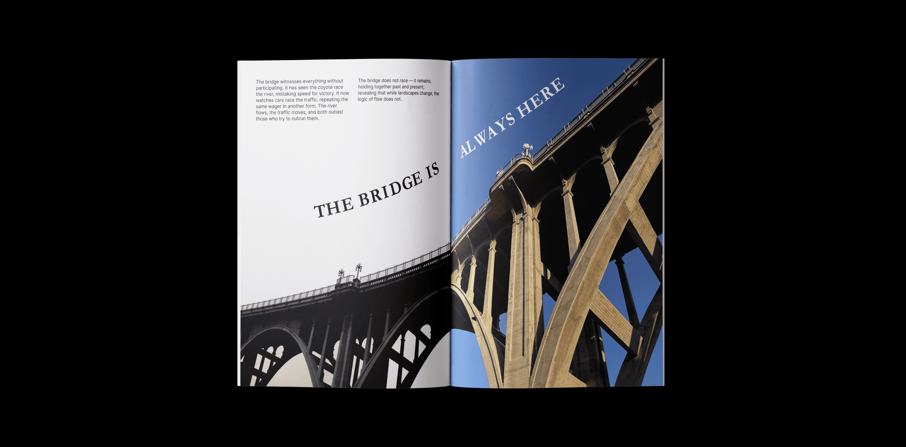 The Bridge Witness is a VR experience inviting people to experience time and flow. It places the bridge as a witness, like a tunnel, with the viewer observing change alongside the bridge and the surrounding landscape.